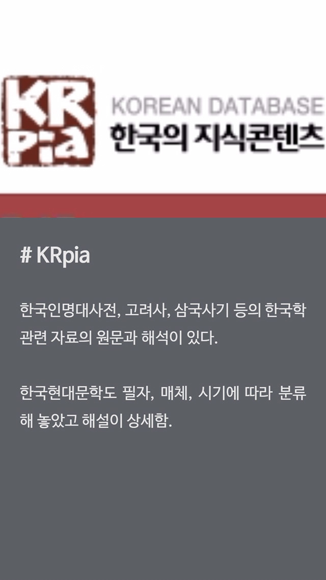 KRpia는 대체로 어문자료 위주입니다. e-book 형태로 제공되어 참고하려는 내용을 그대로 복사할 수 있어 '직접인용'이 간편하다는 장점이 있습니다.
