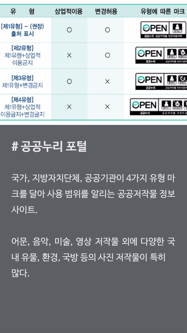 교육용 과제로 쓸 때에는 방대한 공공저작물 중 제1유형을 사용할 수 있습니다. 다운받을 때 따로 로그인이 필요하진 않지만, 저작물을 사용할 때 꼭 출처를 기입해 주세요.