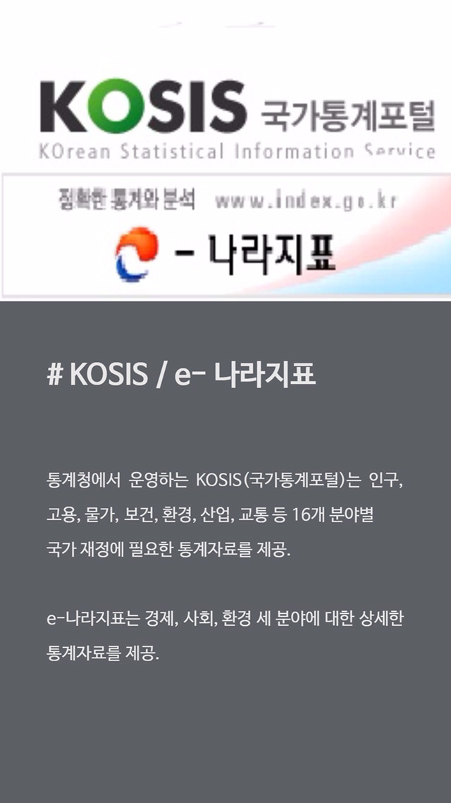 논리를 주장할 때 타당한 근거가 되는 '통계자료'. KOSIS와 e-나라지표는 국가차원에서 조사한 통계이기 때문에 공신력 있는 자료입니다.